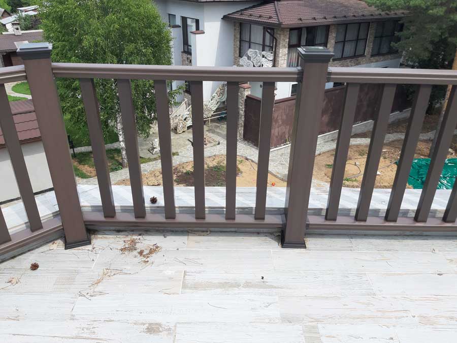 Произвели поставку и шеф-монтаж ограждений из ДПК Holzhof цвета венге (темный шоколад) на открытых площадках на 2-м и 3-м этажах частного дома.